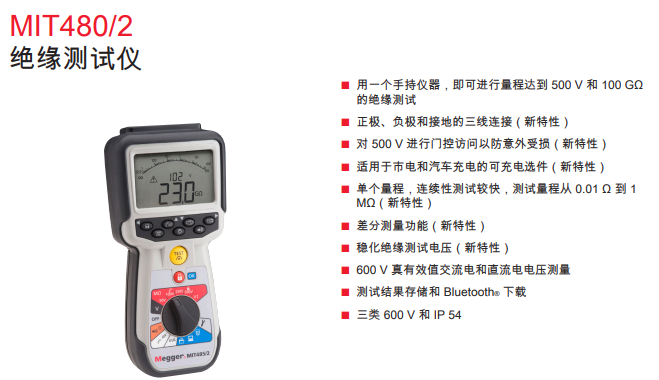 用一部手持儀器,即可進(jìn)行量程最大為500 V 和 100 GΩ的絕緣測試