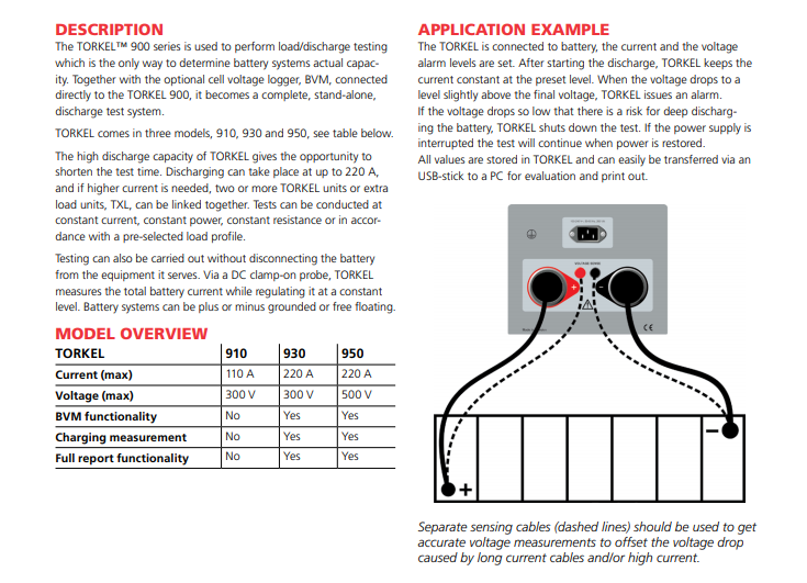 測試可在恒定電流、恒定功率、恒定電阻或按照預(yù)先選定的加載配置文件進(jìn)行。BVM 與電池電壓記錄器目前均直接與 TORKEL 900 相連,成為了一個完整的獨(dú)立放電測試系統(tǒng)。