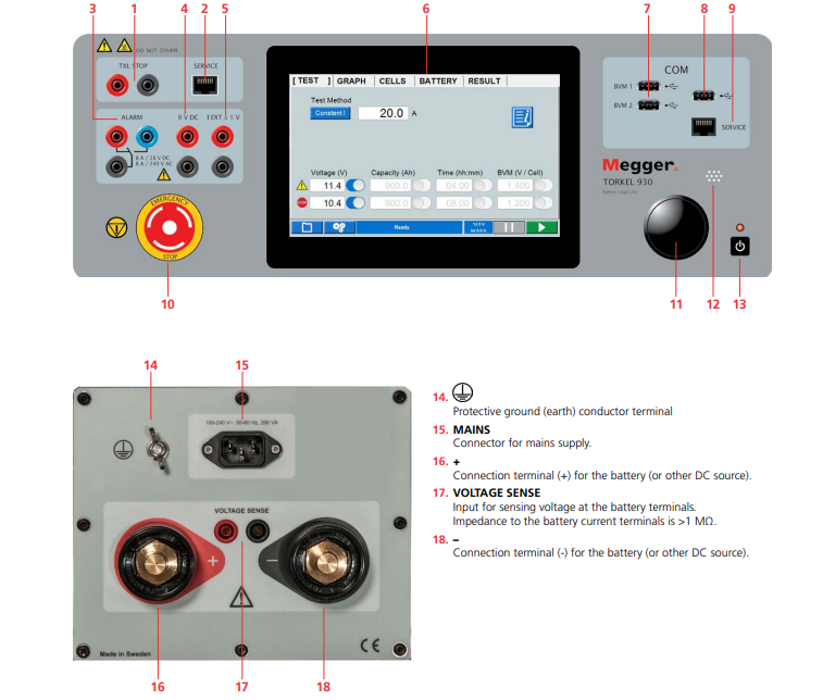 TORKEL 連接至電池后,放電電流和報警級別(電壓、容量和時間)會被設(shè)定。放電開始之后,TORKEL 會將電流保持在預(yù)設(shè)水平。當(dāng)電壓降到略高于終止電壓的水平時,TORKEL 會發(fā)出警報。當(dāng)電壓降到特別低,以致出現(xiàn)深度放電的危險時,TORKEL 會關(guān)閉測試。所有值都將存儲在 TORKEL 中,并可以通過 USB 存儲器輕松傳輸至 PC 以用于評估。