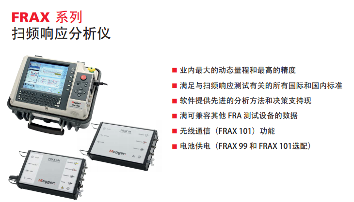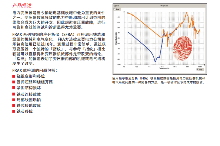 FRAX 系列掃頻響應分析儀(SFRA) 能偵測其它方法無法偵測到的潛在機械和電氣問題。許多電網公司和服務公司使用FRA方法測試變壓器已經有超過十年的時間。通過簡易的測量步驟,儀器會捕捉變壓器的獨特「指紋」,通過測量結果與參考「指紋」的比較,可以看出變壓器的「指 紋」是否有改變。若有改變則暗示了變壓器內部的機械和/或電氣結構有所改變。