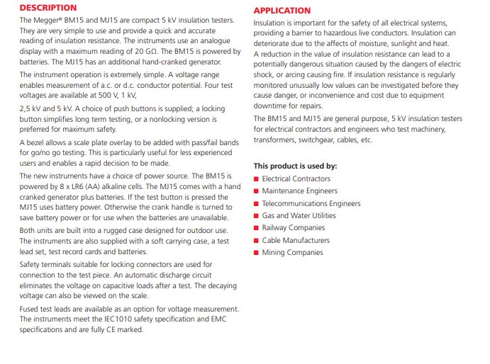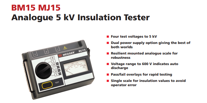 BM15和MJ15是通用,5 kV絕緣測(cè)試儀,用于測(cè)試機(jī)械,變壓器,開關(guān)設(shè)備,電纜等的電氣承包商和工程師。
