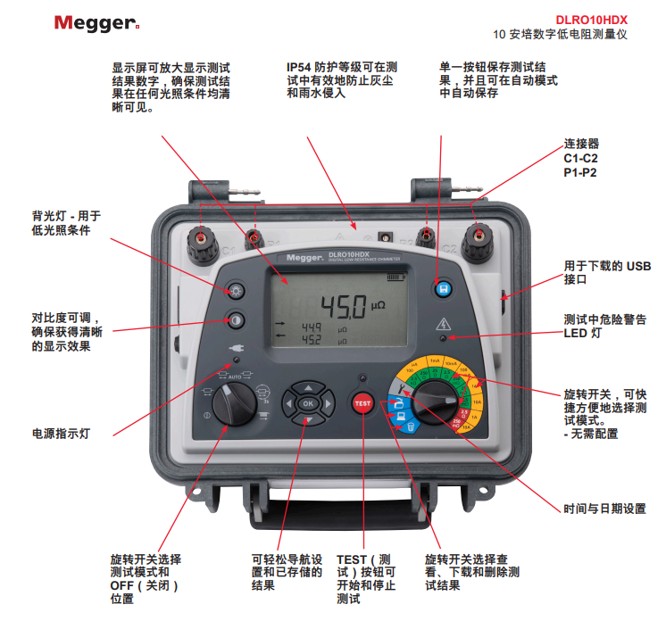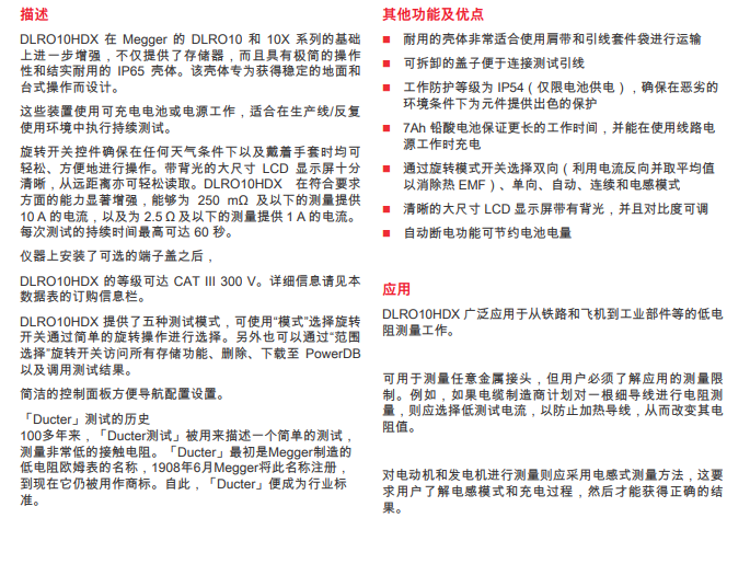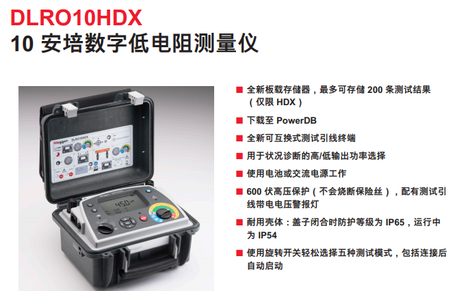 DLRO10HDX增強了Megger的Ducter?系列10 A微歐表,結(jié)合了終極的操作簡便性和堅固的IP65外殼,可實現(xiàn)穩(wěn)定的地面和工作臺操作,并提供存儲空間。