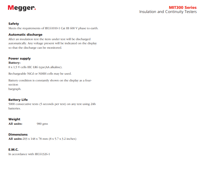 經(jīng)過(guò)廣泛的客戶研究,特別為了滿足今天的電力客戶的要求而開(kāi)發(fā)的,新的Megger MIT300系列絕緣和連續(xù)性測(cè)試儀不僅耐用和易于使用的,而且添加了一個(gè)在意外誤用的情況下保證人員安全的功能。