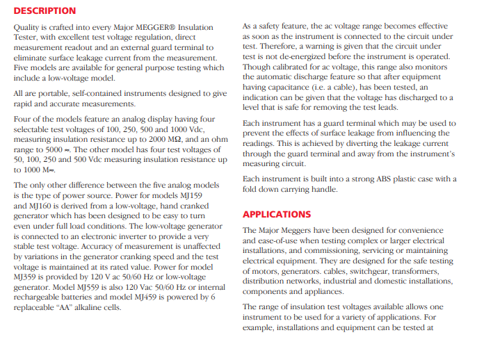 其中四個型號擁有模擬顯示,具有四個可選擇的試驗電壓100、250、500和1000 V dc,測量絕緣電阻高達2000 M-Ohms,以及電阻范圍至5000 ohms。其他的型號擁有四個測試電壓,為50、100、250及500 V dc,測量絕緣電阻高達1000 M-Ohms。