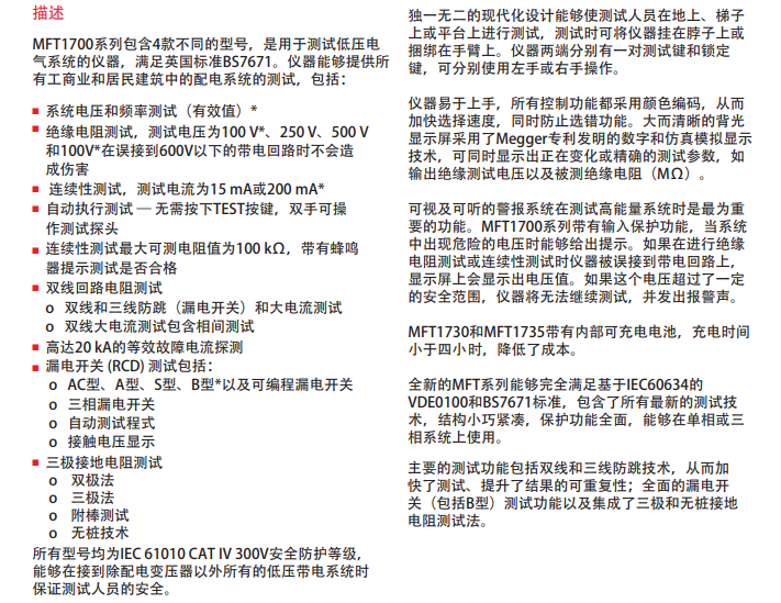MFT1700系列包含三個產(chǎn)品用于測試低電壓電氣設(shè)備。它們提供了的測試可以完成工業(yè)、商業(yè)和家用的固定布線系統(tǒng)的鑒定測試。