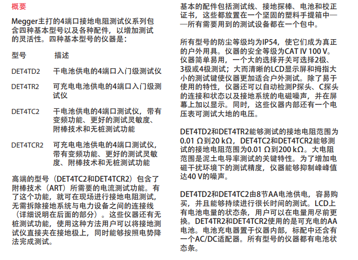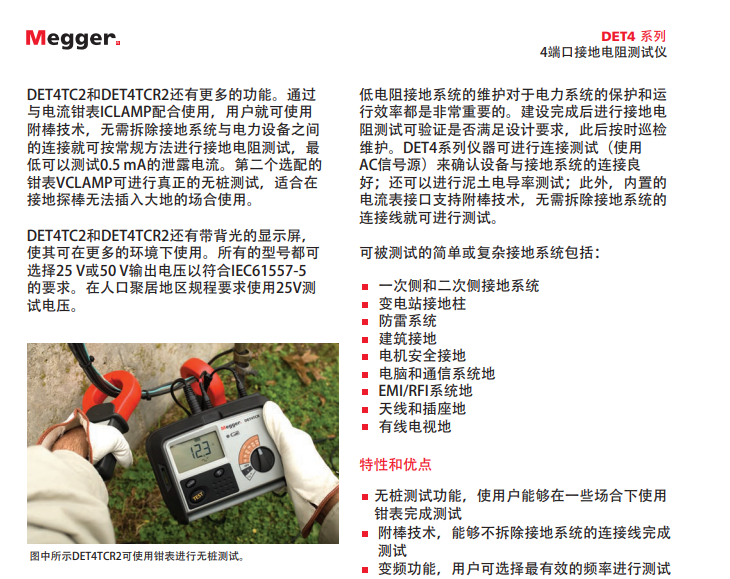 ? DET4TCR2: 充電電池供電的4極測試儀,具有可選擇的測試頻率,更高的測量靈敏度和附棒技術及無需極捧測量能力