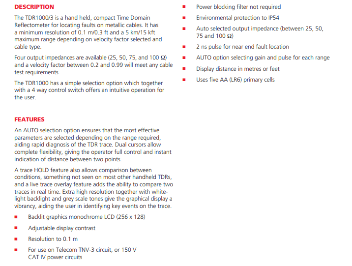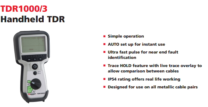 TDR1000/3是一款手持式、緊湊型的時域反射儀, 識別和定位金屬電纜的故障。它有一個最低分辨率為0.1米,及和最大射程5公里,取決于速度系數(shù)和電纜類型。