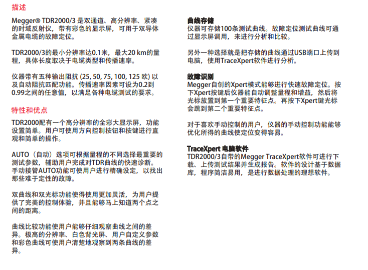 TDR2000/3 系列是一個高度便攜、分辨率高、結(jié)構(gòu)緊湊的雙通道時域反射計,帶彩色大屏幕,可定位配對金屬電纜的故障,可以應(yīng)用于街道照明、電話和 CATV 等。