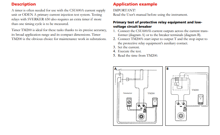當(dāng)使用CSU600A電流供應(yīng)設(shè)備或ODEN A一次電流注入測(cè)試系統(tǒng)時(shí)往往需要一個(gè)定時(shí)器;使用SVERKER 650測(cè)試?yán)^電器時(shí),若要測(cè)量多個(gè)時(shí)間周期,也需要額外的定時(shí)器。