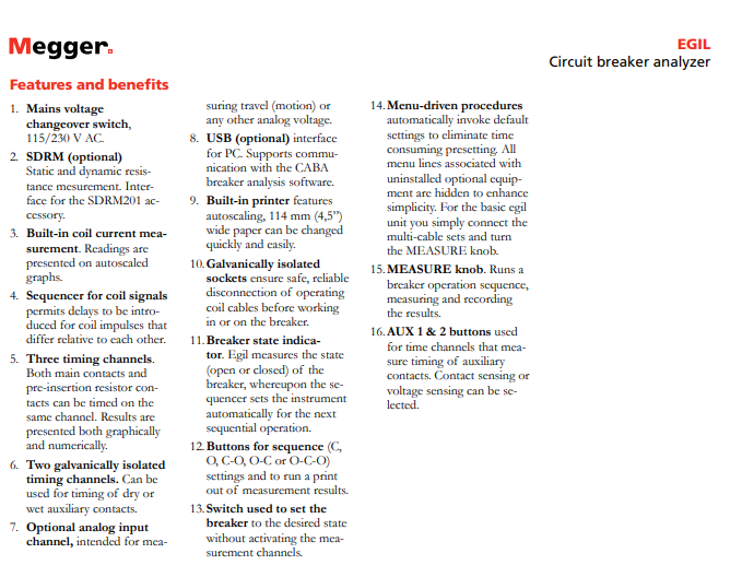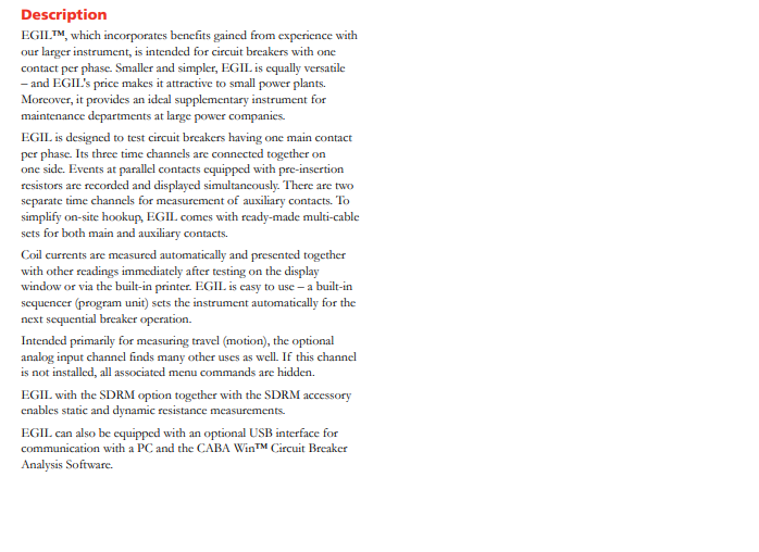 EGIL是一個自動的計時器和移動分析儀,能測試中壓和高壓變電站的斷路器, 主要針對每相一個接點的斷路器。EGIL結(jié)合了普遍應(yīng)用在復(fù)雜測試系統(tǒng)的功能,但它的設(shè)計較其他類似測試儀更小巧、簡易使用。它的價格對中小企業(yè)來說十分具有吸引力,它也是大型能源公司和測試部門理想的輔助產(chǎn)品。