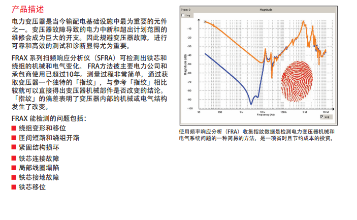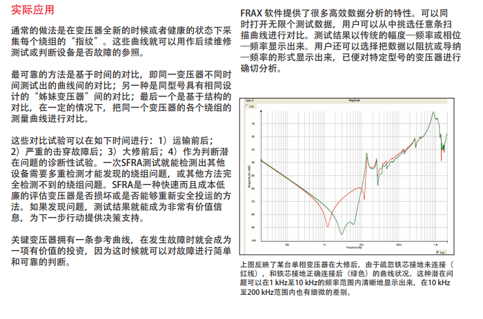 FRAX 系列掃頻響應分析儀(SFRA) 能偵測其它方法無法偵測到的潛在機械和電氣問題。許多電網(wǎng)公司和服務(wù)公司使用FRA方法測試變壓器已經(jīng)有超過十年的時間。通過簡易的測量步驟,儀器會捕捉變壓器的獨特「指紋」,通過測量結(jié)果與參考「指紋」的比較,可以看出變壓器的「指 紋」是否有改變。若有改變則暗示了變壓器內(nèi)部的機械和/或電氣結(jié)構(gòu)有所改變。