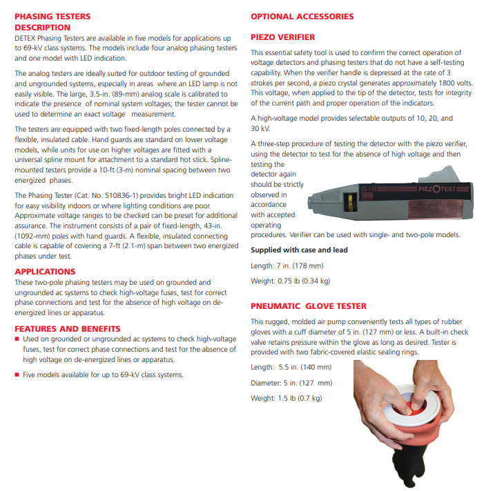 在測(cè)試過程中,探測(cè)器工作范圍內(nèi)的電壓將點(diǎn)亮 LED 燈。內(nèi)置的壓電電壓電源提供測(cè)試功能,以確保探測(cè)器在使用之前運(yùn)行正常。按下按鈕即可啟用自測(cè)。LED 指示器配備了 48 英寸(1219 毫米)伸縮桿,用于校準(zhǔn)和標(biāo)記探測(cè)器等級(jí)內(nèi)的電壓。這些等級(jí)劃分有助于使用者將伸縮桿調(diào)整到安全操作所需的長(zhǎng)度。不使用時(shí),伸縮桿可以縮回到 34 英寸(864 毫米),可方便地存放在一個(gè)塑料手提箱內(nèi)。