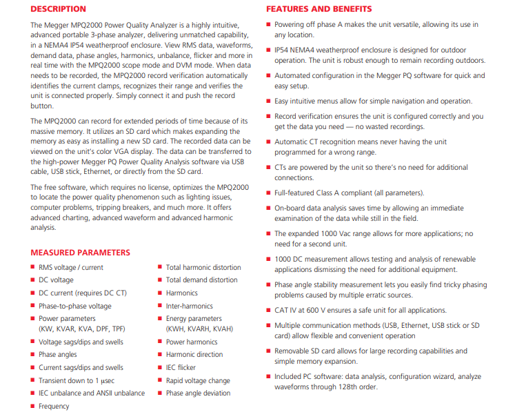 MPQ2000 便攜式電源質(zhì)量分析儀的多項(xiàng)特性,例如堅(jiān)固和耐風(fēng)雨的硬件、通過(guò) A 相或輔助電源供電,使其適合在任何環(huán)境中測(cè)試電能質(zhì)量。