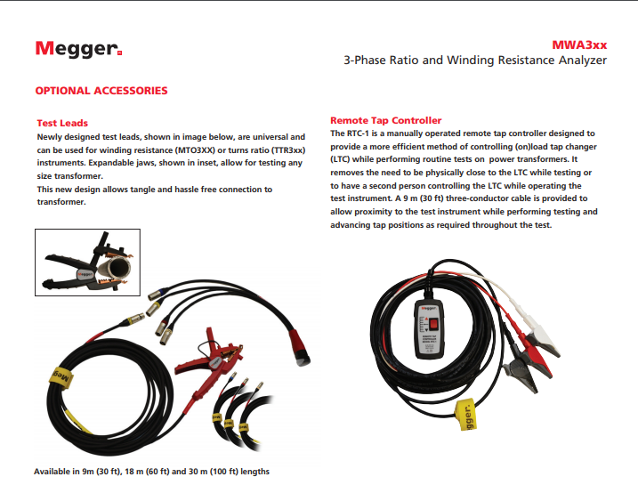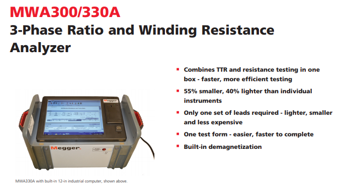 Megger MWA300 和 330A 變壓器繞組分析儀將變比和直阻測試儀組合到一個裝置中,是更快、更高效的測試設(shè)備。