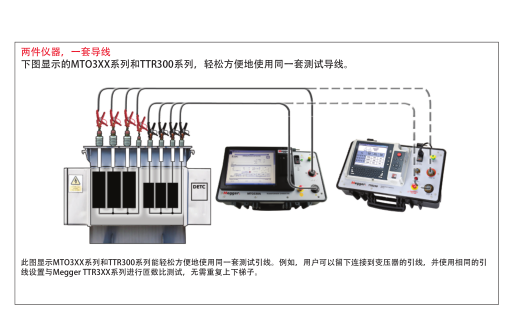 MTO300系列與Megger TTR300系列有通用的測(cè)試電纜,因此同時(shí)擁有匝數(shù)比和繞組電阻測(cè)試儀的用戶可以節(jié)省時(shí)間和金錢。