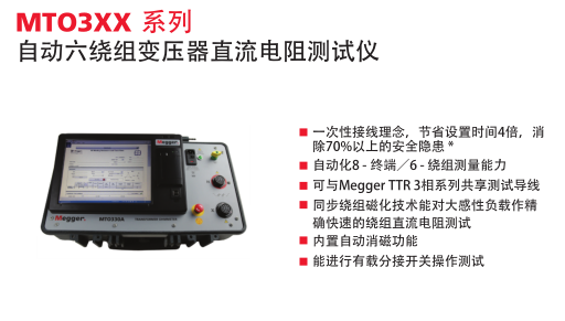 MTO300系列提供8-端子/ 6繞組的電阻測(cè)量能力。無(wú)需斷開并重新連接測(cè)試中的導(dǎo)線,便可以測(cè)試所有正常的6繞組,從而節(jié)省用戶的測(cè)量時(shí)間。