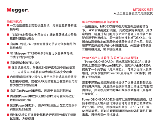 MTO300系列與Megger TTR300系列有通用的測試電纜,因此同時擁有匝數(shù)比和繞組電阻測試儀的用戶可以節(jié)省時間和金錢。