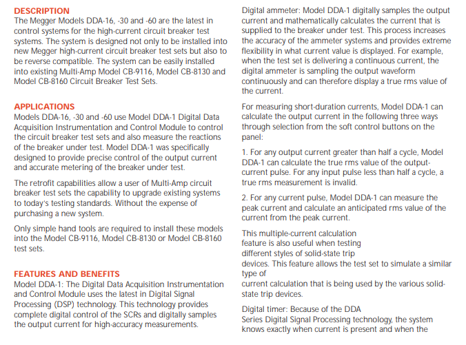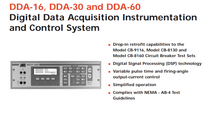 DDA-16、-30、-60使用最新DSP技術(shù)控制斷路器測試儀和測量測試中斷路器的反應(yīng),加配能力讓多安培斷路器測試儀的用家可提升現(xiàn)有系統(tǒng)而不需購買一個新系統(tǒng)。DSP技術(shù)提供SCR完整的數(shù)字式控制和數(shù)字式地抽驗輸出電流作高精度測量。