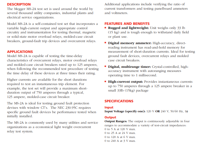 MS-2A是獨立的測試設備,高電流輸出功能和控制功能集成在同一臺機器上。該儀器可測試熱、磁及固態(tài)電機過載繼保儀器、斷路器、接地故障跳閘器件和過流繼保儀器。