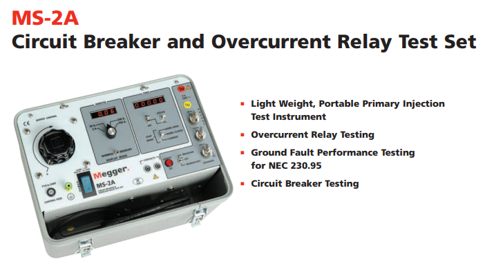MS-2A 型號能夠測試最高額定電流為 125 A 的過流繼電器、電機過載繼電器和塑殼斷路器的時延特性;測試時,需要遵循針對這三種裝置建議的時延測試步驟,并使用等于其額定電流三倍的電流。會在短時間內提供較高電流,用于測試瞬時跳閘元件。例如,這款測試儀會通過典型的 125 A 塑殼斷路器提供最高 750 A 的短時間輸出。MS-2A 非常適用于測試帶有窗口式電流互感器的接地故障保護設備。首次安裝 NEC 230.95C 時,需要對特定接地故障保護設備進行性能測試。MS-2A 是經濟實惠、輕型的過流繼電器測試系統(tǒng),被很多公用事業(yè)公司和服務組織所采用。這款設備的其他應用包括檢驗電流互感器變比以及測試面板型電流表和電壓表。
