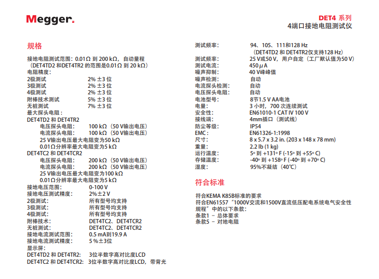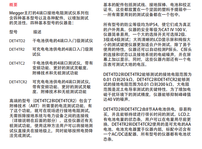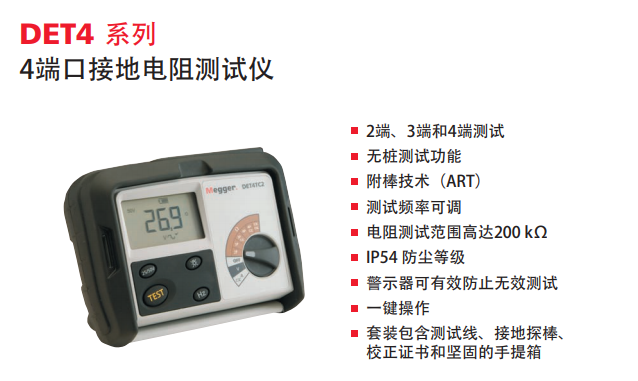 ? DET4TCR2: 充電電池供電的4極測試儀,具有可選擇的測試頻率,更高的測量靈敏度和附棒技術及無需極捧測量能力